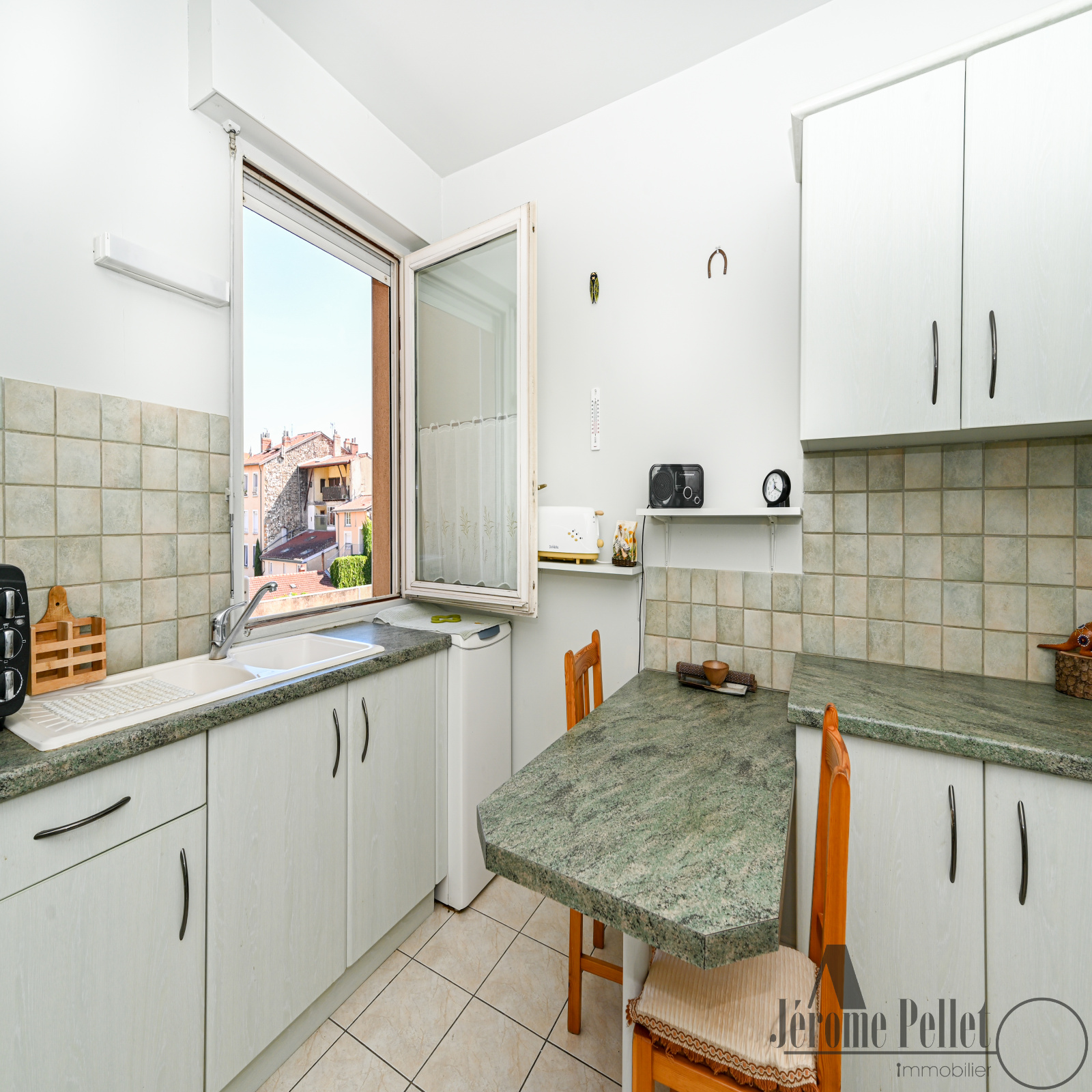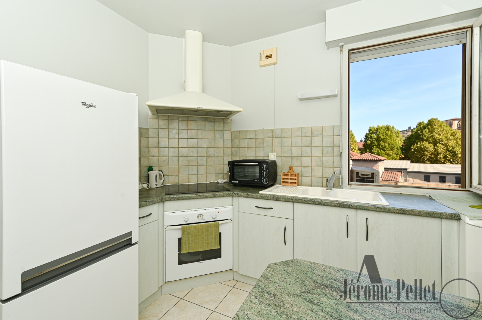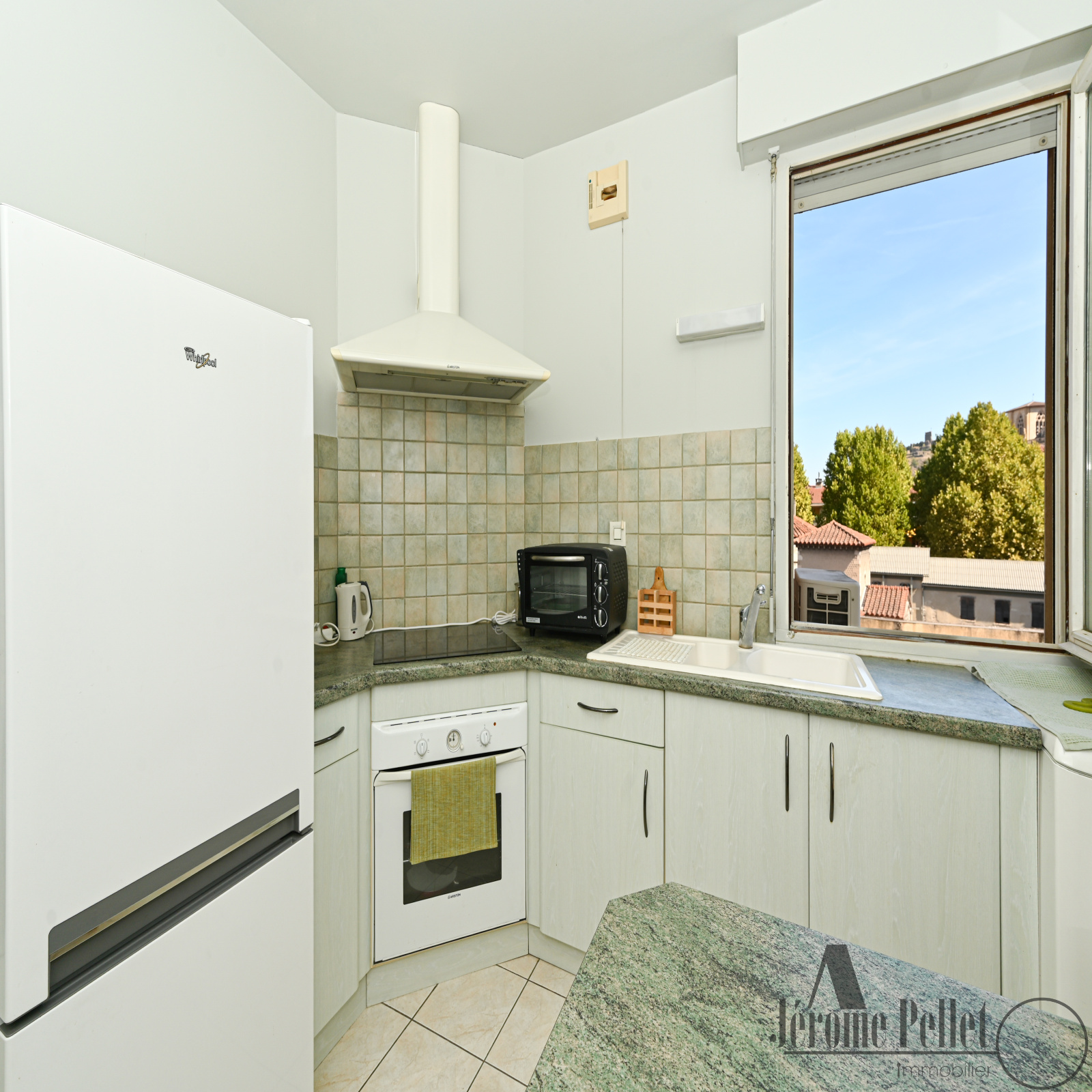 Une cuisine séparée, semi-équipée, avec vue sur la cathédrale Saint-Maurice,